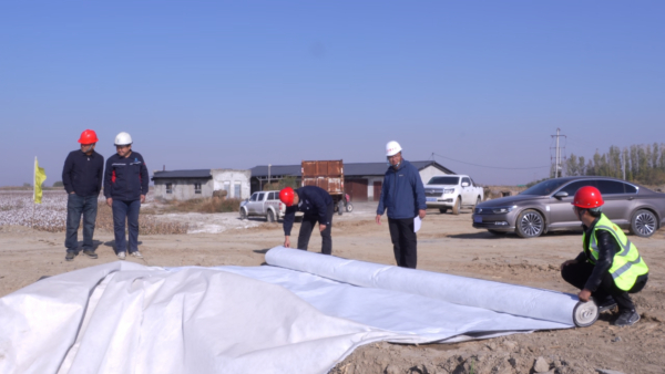10月11日,沙湾市水利局项目负责人及施工监管人员在现场查看防渗水材料。特来克·木哈买提江摄