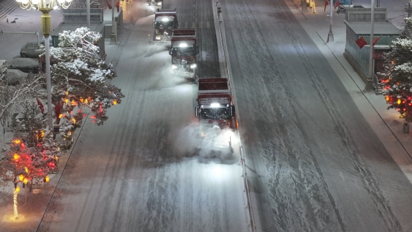 当日中午雪情出现后,市城市管理局立即启动应急预案,将市区划分为四个作业区域,调度全新的清雪设备与作业队伍上岗。大型滚刷扫雪机在主干道清除路面积雪,并对易结冰路段撒融雪剂,小型设备和人工清扫队伍同步清理人行道、非机动车道及学校周边、十字路口等人员车辆密集区域,实现“雪落即清、即清即通”。