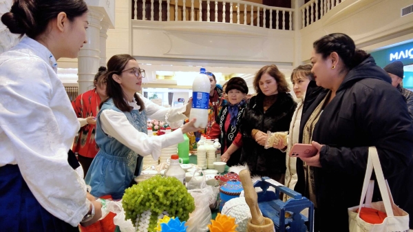 游客在展会上购买奶制品。阿那尔古丽·瓦力曼摄
