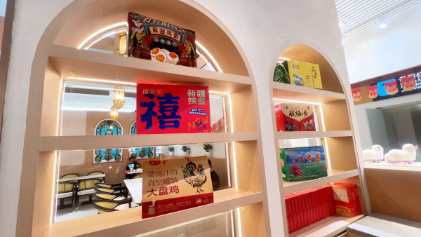 1月5日,记者走进这家直营店,浓郁的香味瞬间扑面而来。后厨内,厨师正颠勺翻炒鸡块,加入安集海辣椒、博尔通古乡土豆等特色食材慢炖收汁,地道的烹饪手法勾起不少旅客的食欲。门店装修极具特色,新疆传统纹饰点缀其间,搭配简约的现代用餐桌椅,既满足了旅客快速就餐的需求,也为大家提供了舒适的休憩空间。
