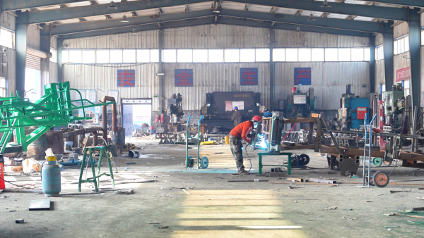 近日,在沙湾市广大农业机械制造有限责任公司生产车间内,工人们在各自岗位上有序忙碌,焊接、切割、铸造成型,现场一派繁忙景象。车间外的空地上,数台机械有序排列,工人正忙着调试、装车。