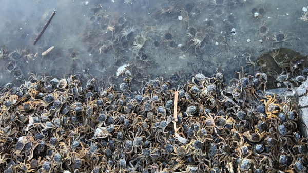 上午10时许,养殖户徐红红正和工人们一起将一箱箱鲜活的蟹苗搬运至岸边,待蟹苗逐步适应池塘水温后,工人们轻轻将蟹苗倒入水中。