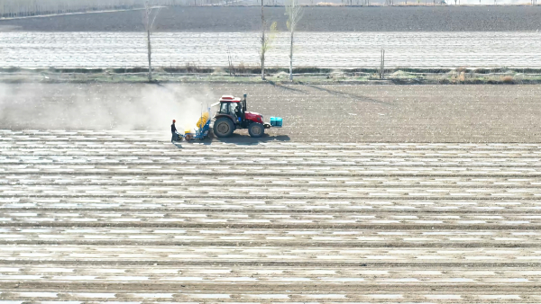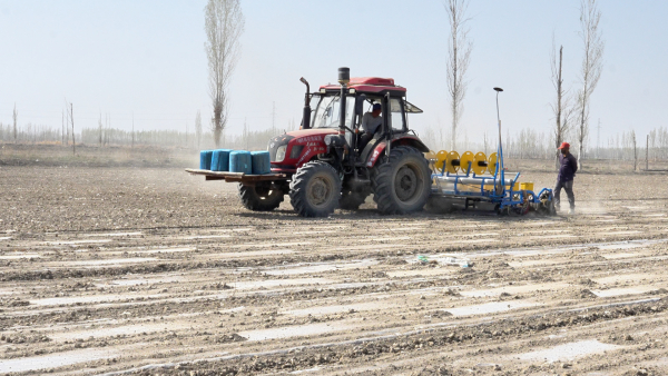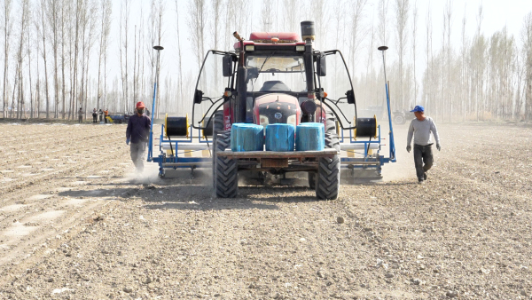 4月7日,在沙湾市安集海镇和平新村的一处农田里,辣椒播种机在北斗导航的助力下,在地里来回穿梭。覆膜、点种、覆土等一系列工序,在播种机的轰鸣声中一完成。